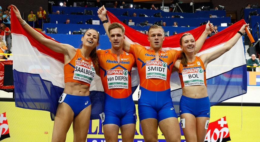 Os Países Baixos venceram a única final do primeiro dia dos ‘seus’ campeonatos da Europa de atletismo em pista curta, em Apeldoorn, com Femke Bol e companhia na estafeta mista dos 4x400 metros.