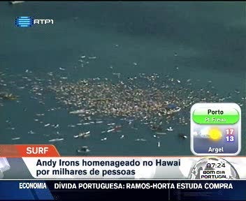 Foi prestada uma homenagem ao surfista Andy Irons. Milhares de pessoas reuniram-se no Hawai para homenagearem o surfista tri-campeão do Mundo que morreu no início deste mês.