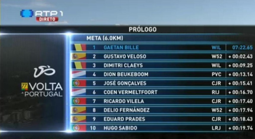 O ciclista belga Gaetan Bille foi o mais rápido no prólogo da Volta a Portugal em bicicleta, que animou a tarde em Viseu. Apenas o espanhol Gustavo Veloso se aproximou dos 7:22:65 que o vencedor demorou a percorrer os 6 km do episódio inaugural da prova.