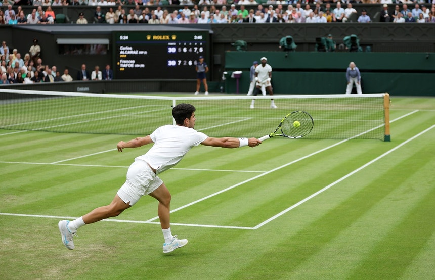 Número três mundial e vencedor de Roland Garros há menos de um mês, Alcaraz superou o 29.º da hierarquia em cinco sets, pelos parciais de 5-7, 6-2, 4-6, 7-6 (7-2) e 6-2, em três horas e 50 minutos.