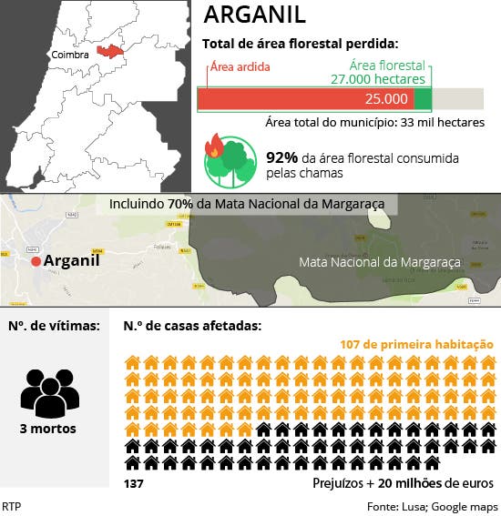 Em Arganil, distrito de Coimbra, o presidente da Câmara descrevia uma situação “incontrolável”. "Há várias aldeias evacuadas. A situação está má. O fogo lavra com grande intensidade, em várias frentes", disse Ricardo Alves.