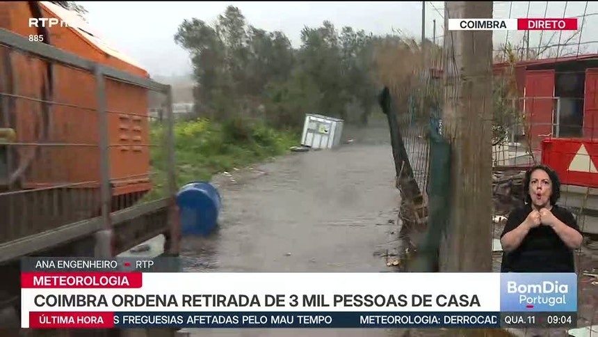 - Há risco iminente de derrocada dos diques em Coimbra e três mil pessoas estão a ser retiradas de casa. O possível colapso poderá provocar inundações, razão pela qual a Câmara Municipal decidiu ainda evacuar três lares em São Martinho do Bispo. A decisão foi tomada depois de uma reunião entre a autarquia, a Proteção Civil e a Agência Portuguesa do Ambiente;
