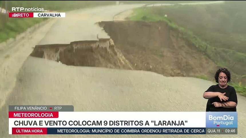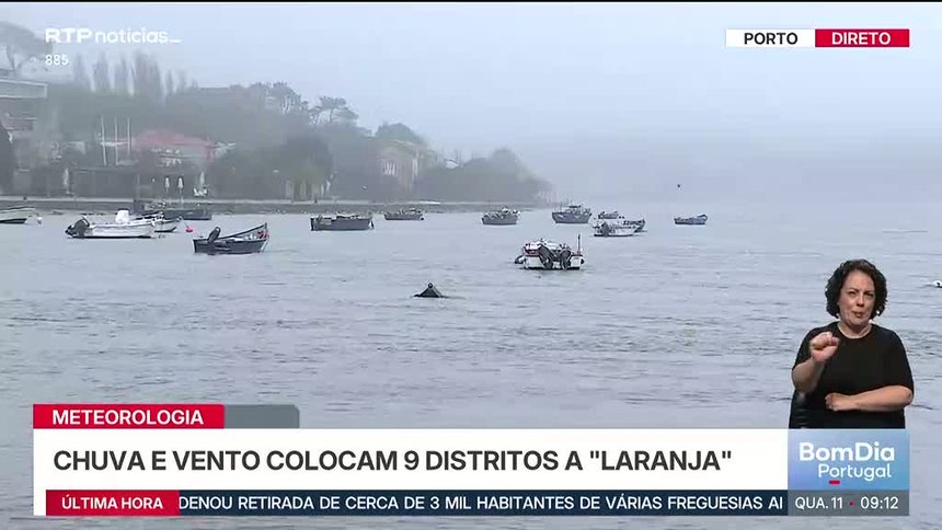 - A meteorologia prevê chuva persistente e por vezes forte nas regiões Norte e Centro. A norte do Rio Mondego, as rajadas de vento podem atingir 100 quilómetros por hora nas terras altas. Estão debaixo de aviso laranja os distritos de Coimbra, Viseu, Porto, Vila Real, Viana do Castelo, Aveiro e Braga;