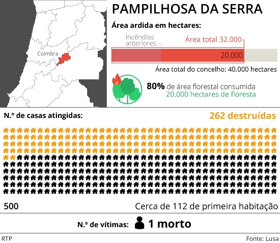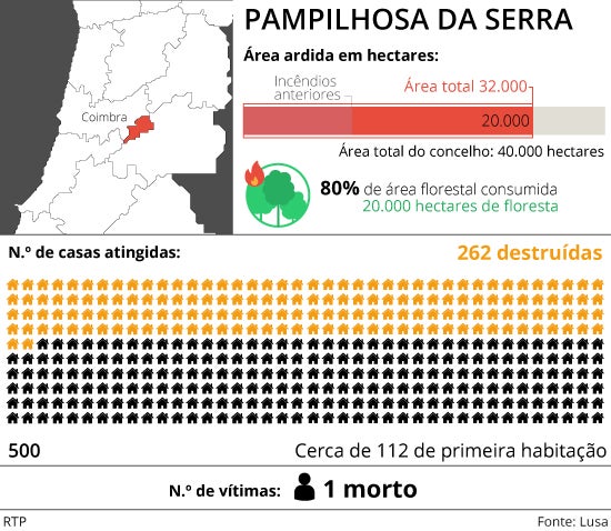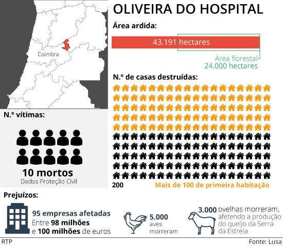 "Estamos a avaliar os prejuízos, que são imensos, nomeadamente a destruição de casas de primeira habitação, dependências, aviários, explorações agrícolas, tratores, carros... Foi uma coisa dantesca", sublinhava o autarca à Lusa, lembrando que o incêndio provocou seis vítimas mortais no concelho.