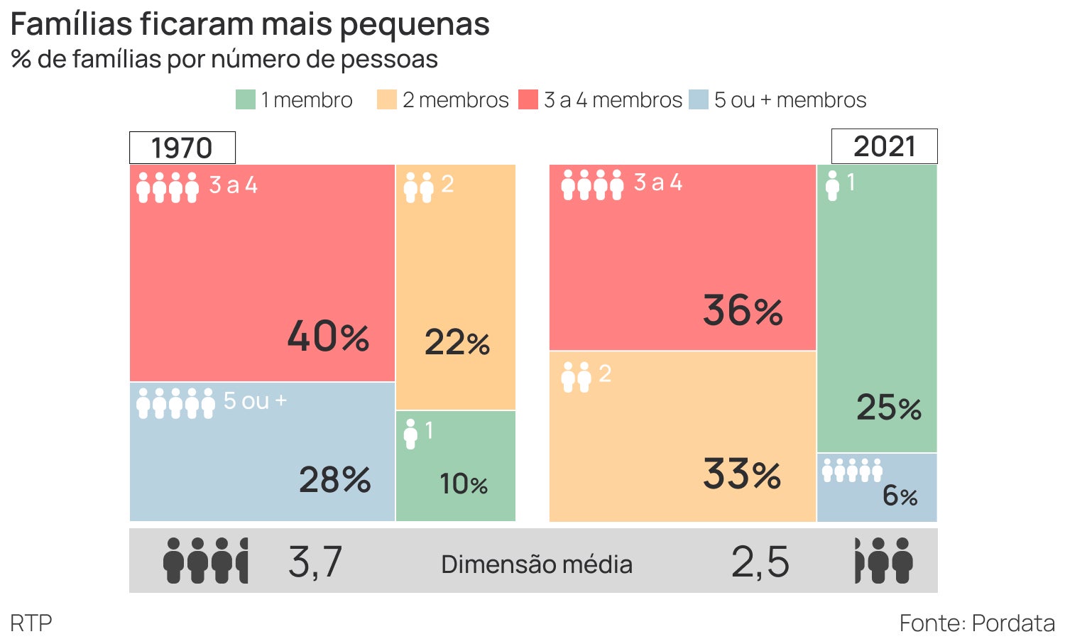 Em 2021, as famílias de três a quatro membros tinham descido para 36 por cento, as de duas pessoas crescido para 33 por cento e as de pessoa única eram já um quarto, 25 por cento. Já as de cinco ou mais membros representavam somente seis por cento.