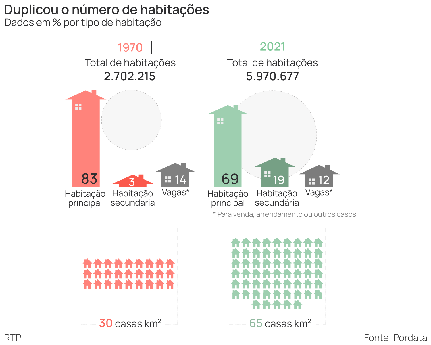 Para além disso, os dados da Pordata permitem também concluir que existem alterações em relação ao tipo de habitações. Há 50 anos havia mais residências usadas como habitação habitual do que existe hoje e atualmente há 15 vezes mais casas de residência secundária.
