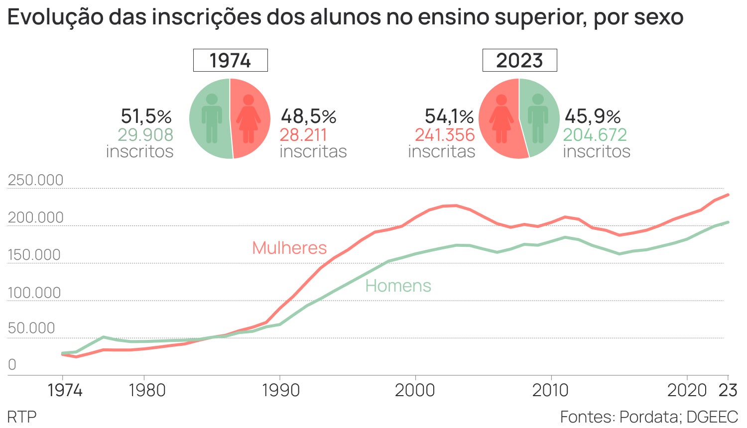 Outro dado a destacar é a diferença entre sexos. Em 1973/1974 havia mais homens matriculados no ensino superior: 52% eram homens e 49% eram mulheres. Ao longo dos anos, a diferença foi-se estreitando e em 1986 a realidade inverteu-se e as mulheres passaram a superar os homens em número de inscritos. Em 2023, 54% do número de alunos inscritos no ensino superior eram do sexo feminino e 46% do sexo masculino.