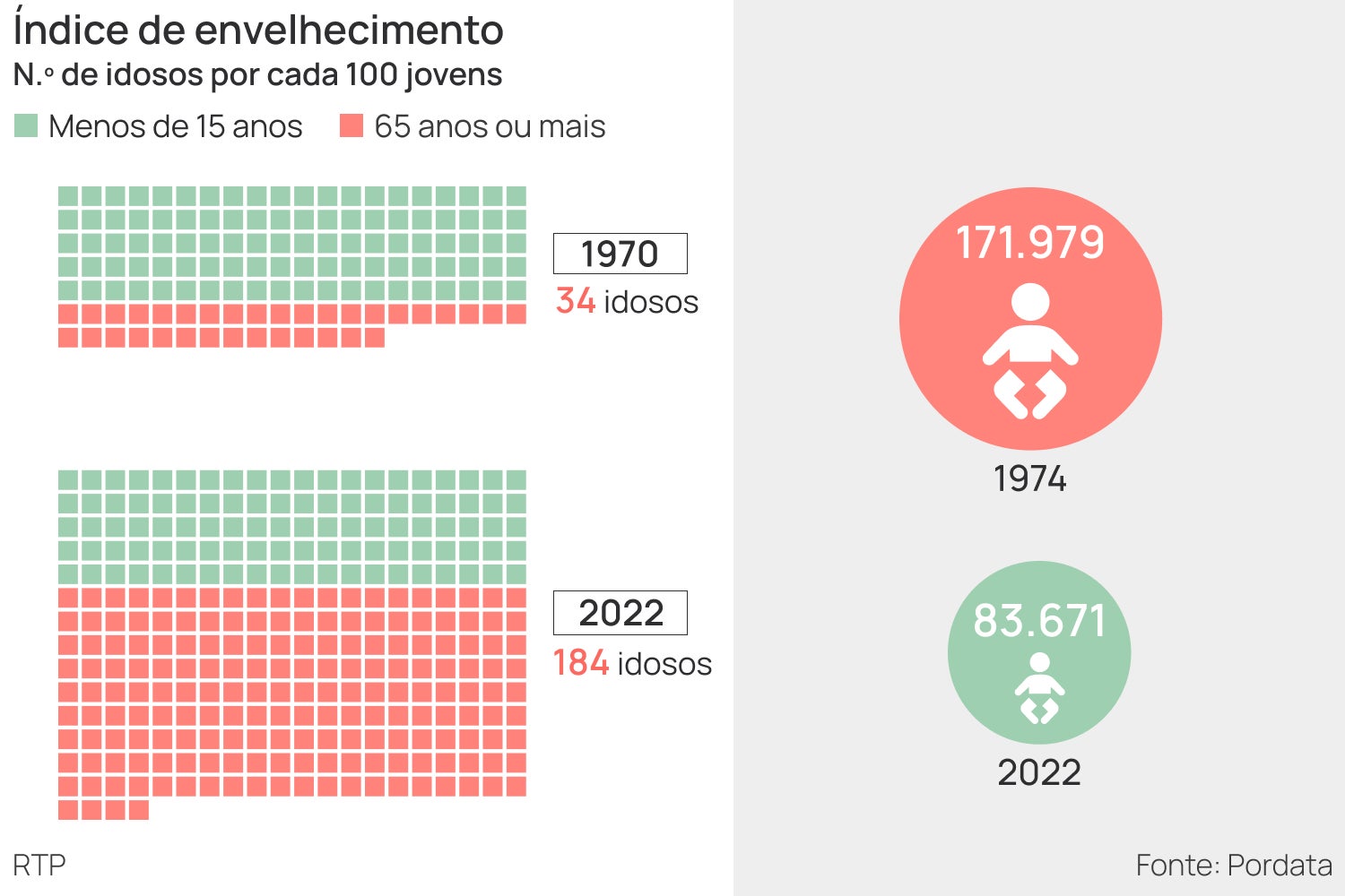 O índice de envelhecimento espelha o peso desta nova realidade. Há agora 184 idosos por cada 100 jovens até aos 14 anos, quando nos anos 70 eram 34.