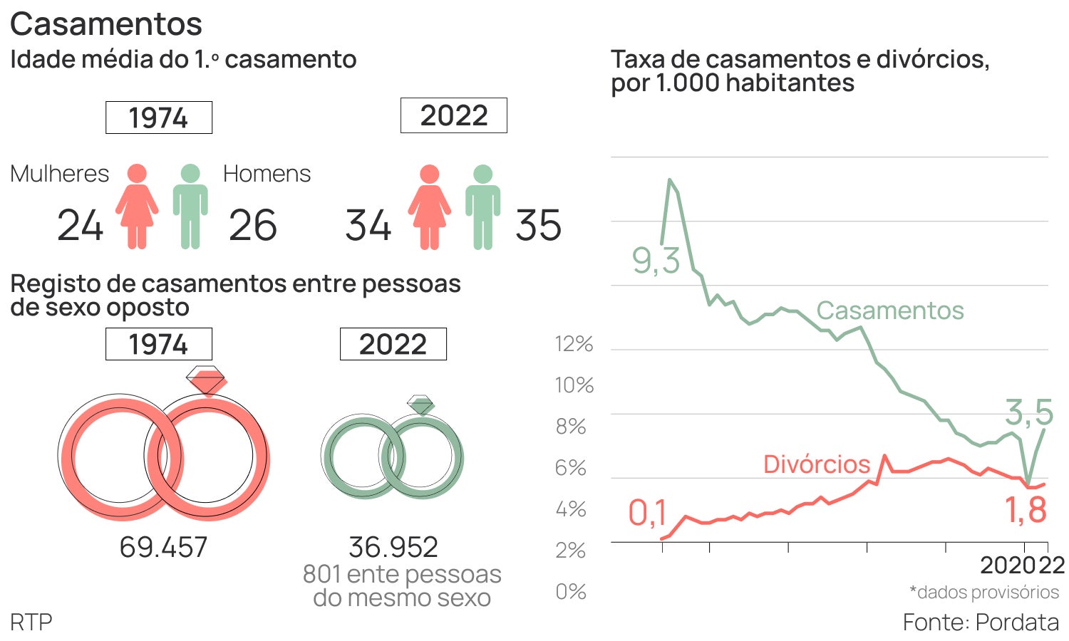 Em média, as portuguesas e os portugueses casam-se agora, respetivamente, pelos 34 e 35 anos, não aos 24 e 26, como há 50 anos. E o número de casamentos caiu para metade. De 81.724 registos em 1974, desceu-se para 36.952 em 2022, dos quais, algo impensável então, 801 entre pessoas do mesmo sexo.