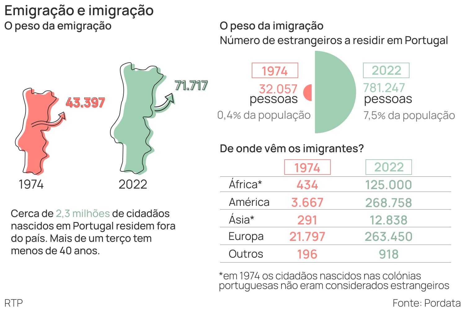 Em 1974, o número de estrangeiros a residir em Portugal correspondia a somente 0,4 por cento da população, com 32.057 indivíduos. Em 2022, representava 7,5 por cento, ou 781.247 pessoas, um número 24,5 vezes superior.