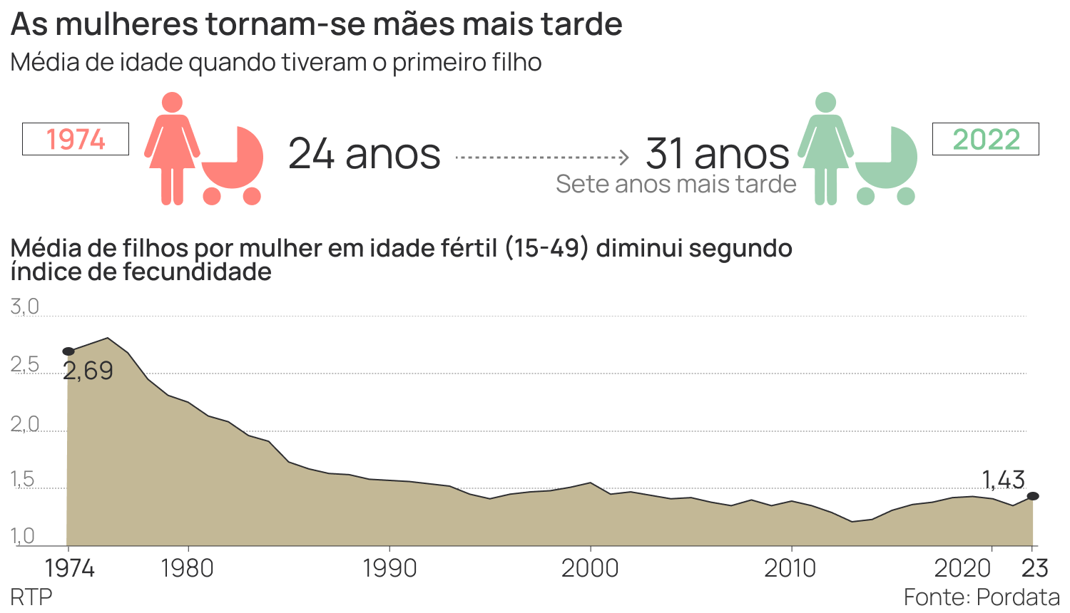 Em 1974, as mulheres tinham o seu primeiro filho, em média, aos 24 anos. A idade foi aumentando de forma constante ao longo dos anos e, atualmente, as mulheres têm o seu primeiro filho, em média, aos 31 anos.