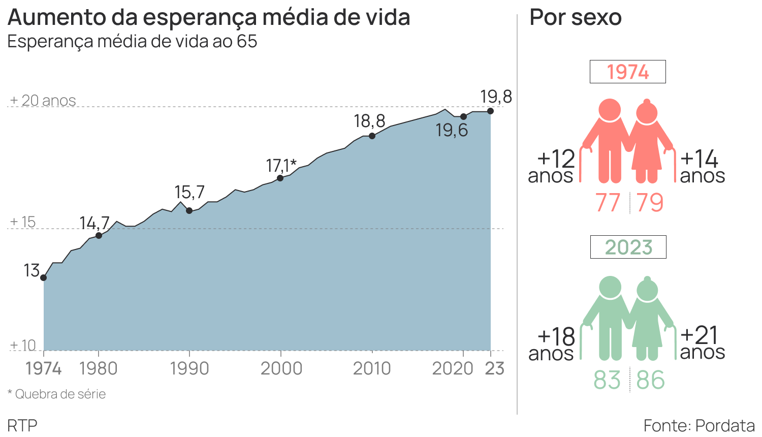 Em 1970, a esperança média de vida era de 67 anos. Atualmente, uma pessoa pode esperar viver, em média, até aos 80 anos.
