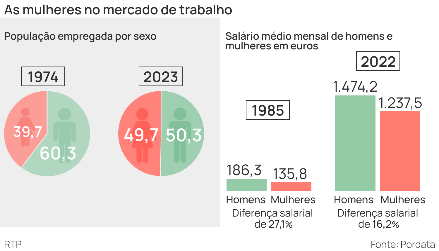 De uma forma geral, em 1985, a diferença no salário médio mensal nas mulheres era de menos 50,5€ em relação aos dos homens, ou seja, uma diferença salarial de 27,1%. Em 2022, as mulheres ganhavam menos 238,7€ do que os homens, o que significa que a diferença salarial diminuiu para -16,2%.