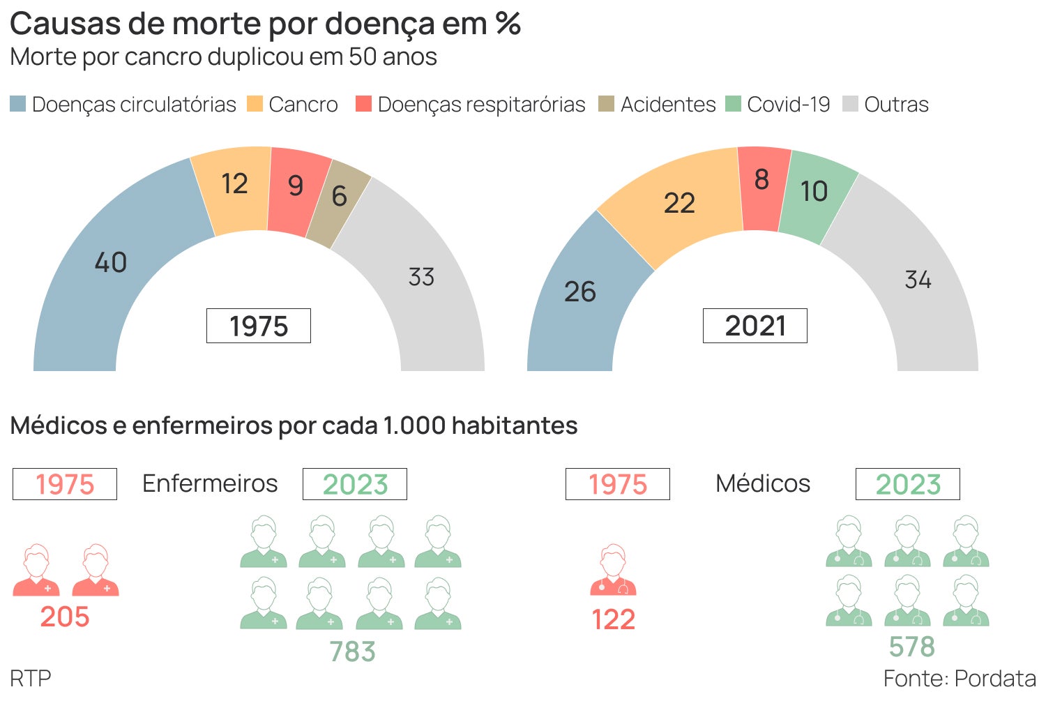 Em relação aos profissionais de saúde, são agora muitos mais do que eram há 50 anos. Em cinco décadas, o número de médicos aumentou quase cinco vezes e o de enfermeiros quase quatro vezes. Em 1975 havia 122 médicos e 205 enfermeiros por casa 100 mil habitantes. Em 2022, esses números aumentaram para 578 e 783, respetivamente.