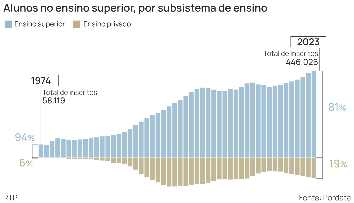 O número de alunos inscritos no ensino público continua a ser superior, embora a diferença seja menor em relação a 1974. Nesse ano, 94% dos alunos estavam matriculados em instituições do ensino público e apenas 4% frequentavam o privado. Em 2023, 81% dos alunos inscritos foram para o ensino superior público e 19% para o privado.