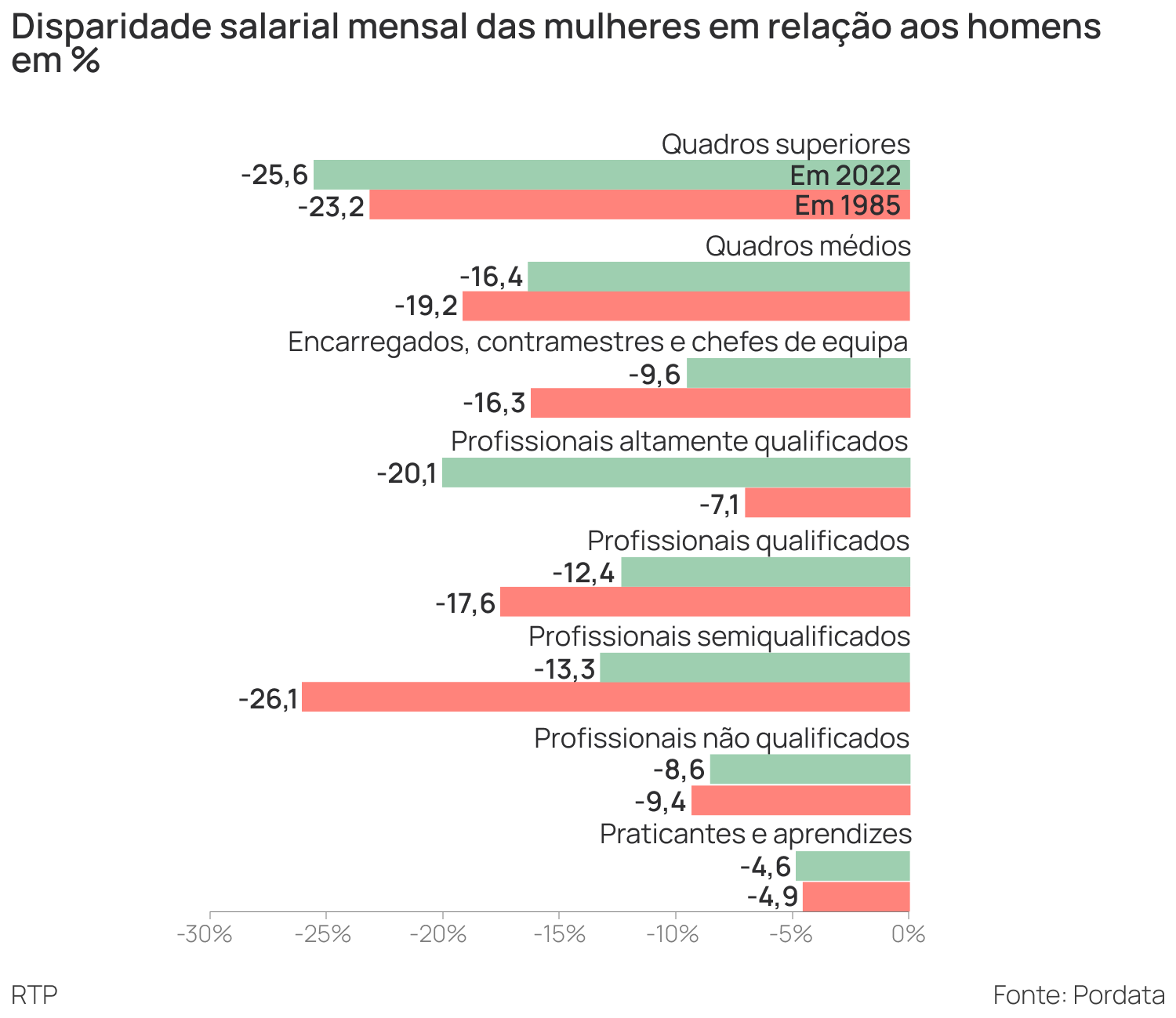 No entanto, se olharmos para os quadros superiores, esse fosso entre sexos praticamente estagnou. Em 1985, a diferença no salário médio entre mulheres e homens era de -23,2% nos cargos superiores e em 2022 era de -25,6%