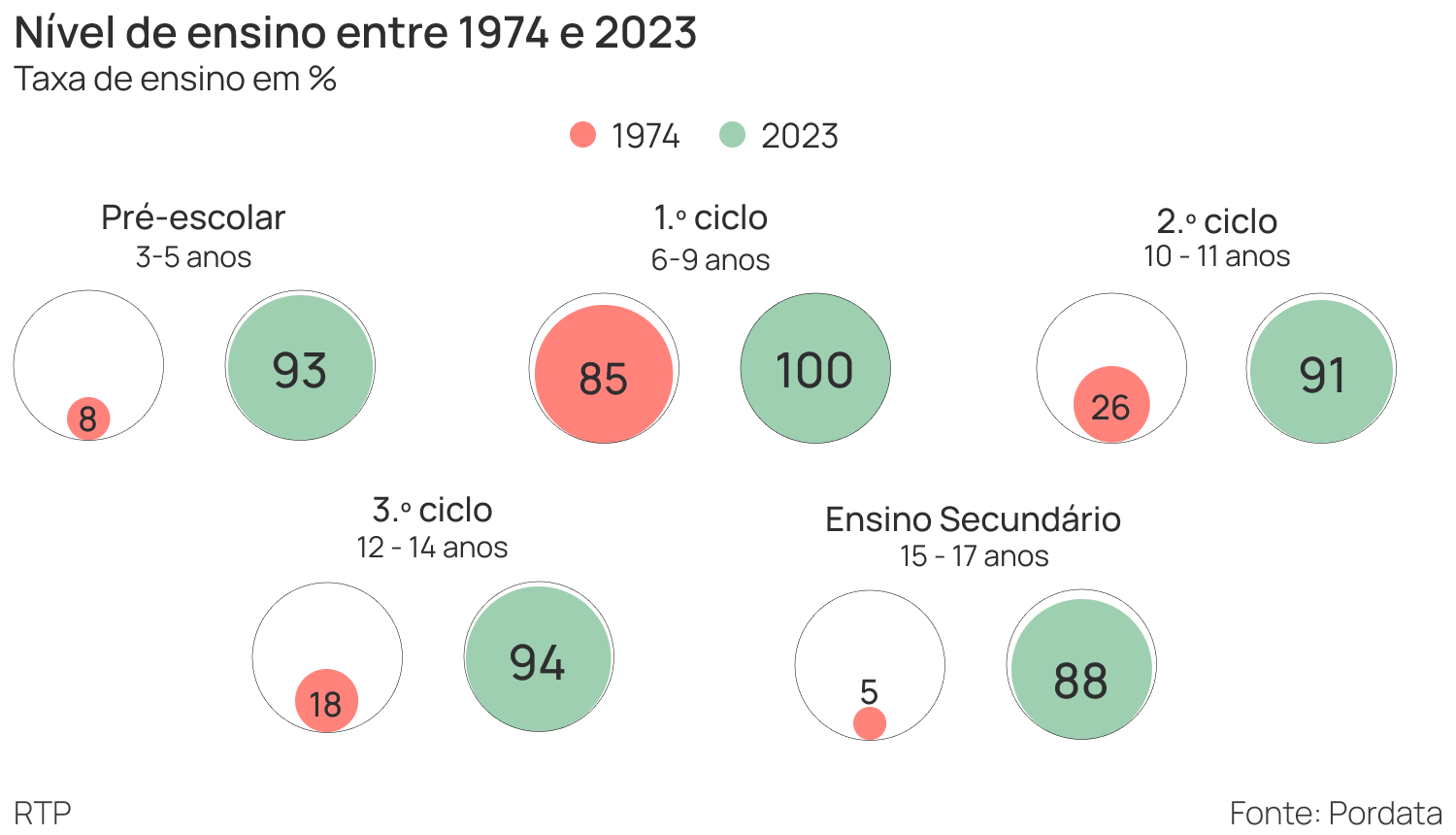 Em 1974, somente 18% chegava ao terceiro ciclo e apenas 5% concluiu o ensino secundário. Hoje em dia, 94% da população tem o primeiro ciclo e 88% concluiu o secundário.