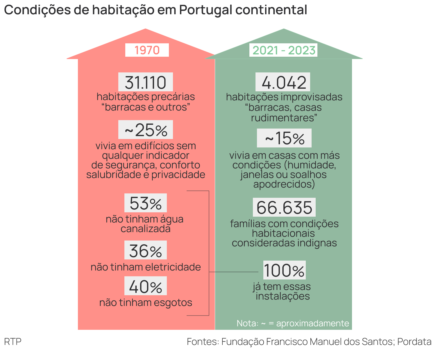 Apesar de as habitações precárias terem diminuído ao longo dos últimos 50 anos, elas não desapareceram. Segundo a Fundação Francisco Manuel dos Santos, entre 2020 e 2023 foram identificadas 4042 habitações improvisadas (“barracas e casas rudimentares”) e aproximadamente 15% da população vivia em casas com más condições (humidade, janelas ou soalhos apodrecidos).