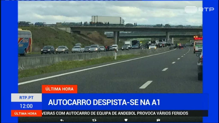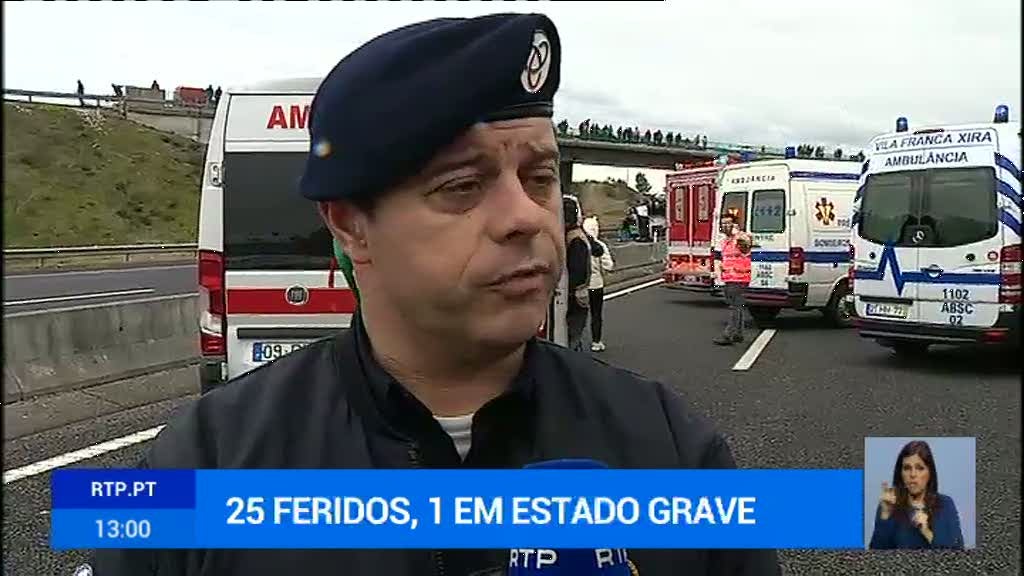 O despiste de um pesado de passageiros pelas 11h25 na zona de Aveiras, ao quilómetro 48.7 da A1, fez pelo menos 22 feridos, entre eles um em estado grave.