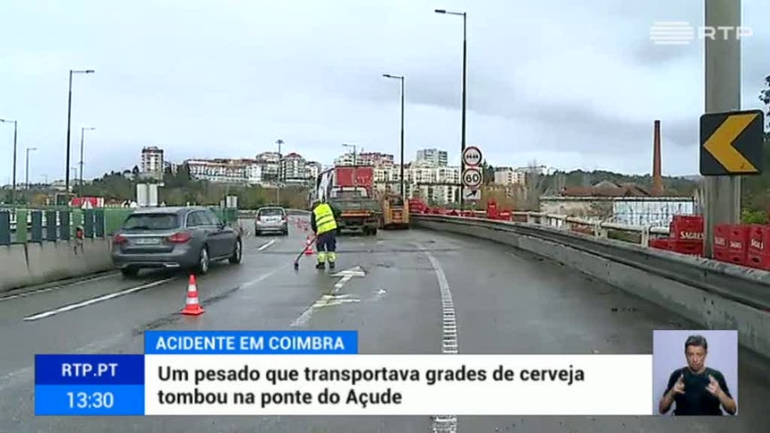 Um pesado que transportava grades de cerveja despistou-se esta manhã na ponte do Açude, em Coimbra. O acidente não fez feridos mas provocou congestionamento no trânsito, no sentido Sul-Norte, porque toda a mercadoria ficou espalhada na via.