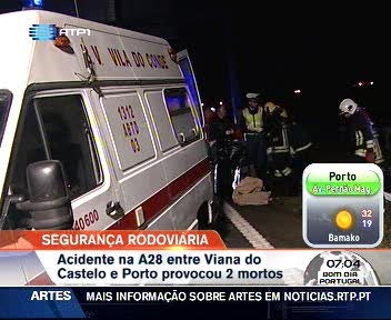Um acidente na A28, perto de Vila do Conde, fez dois mortos e um ferido grave. Os mortos são dois polícias com 25 anos. O ferido grave sofreu fracturas nas pernas e foi transportado para o Hospital de S.João no Porto. O carro em que se seguiam despistou-se e galgou o separador central. A GNR diz que as causas do acidente estão ainda por apurar.