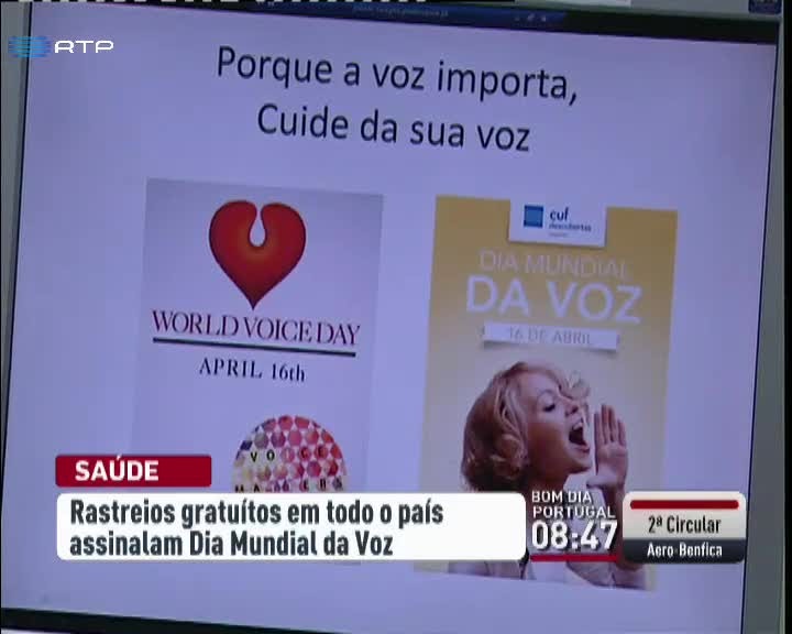 Comemora-se esta quinta-feira o Dia Mundial da Voz. A data celebra em todo o mundo este importante instrumento de comunicação. Diferentes hospitais e associações promovem rastreios gratuitos e alertam para os cuidados que se deve ter com a voz. Ana Ferreira, terapeuta da fala, alerta para o facto do tabaco e o álcool serem os principais inimigos da voz.