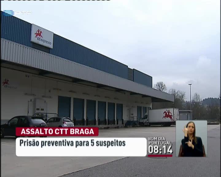 Ficaram em prisão preventiva cinco dos seis homens suspeitos do assalto à mão armado nos CTT de Celeirós, em Braga. No assalto da passada quinta-feira, os suspeitos terão feito vários disparos para o ar, para intimidar uma dezena de funcionários dos correios tendo roubado 32 mil euros. Os detidos, com idades compreendidas entre os 26 e os 46 anos, têm actividades associadas à segurança em estabelecimentos de diversão noturna e residem nos concelhos de Braga e Guimarães.
