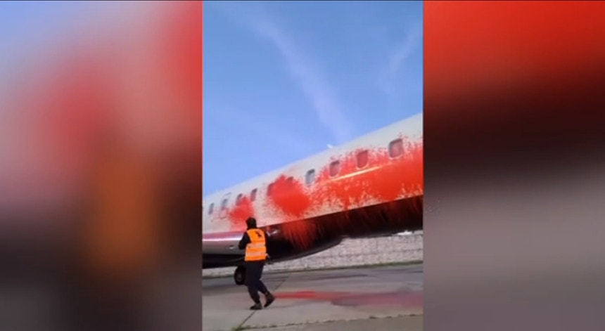 Pintaram um jato privado e acorrentaram-se ao avião durante largos minutos até à chegada das autoridades. A pista ficou interrompida.