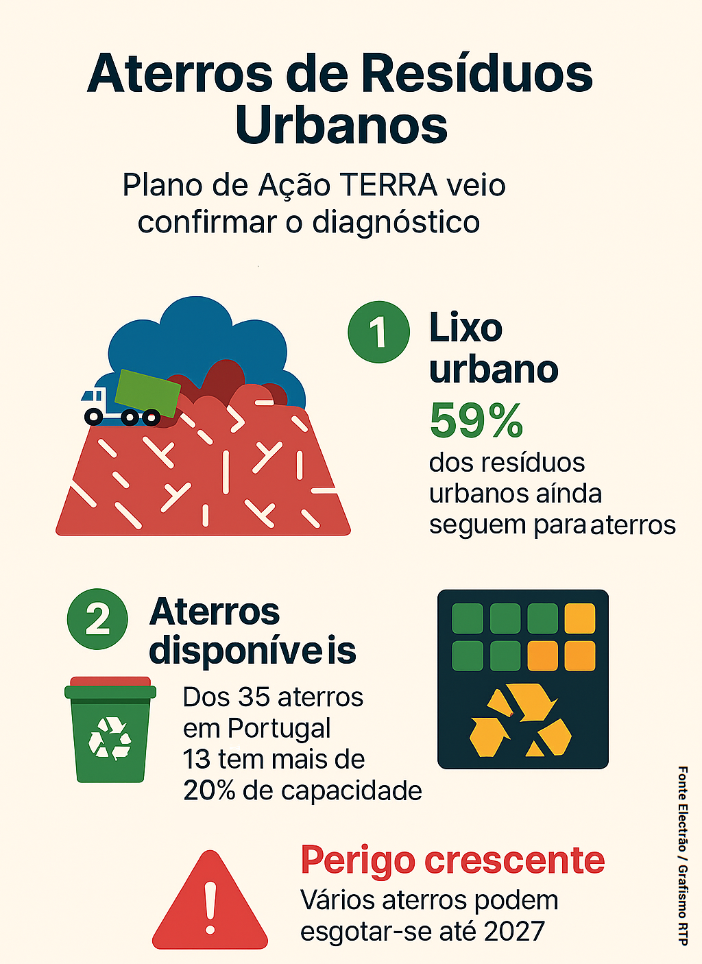 Cerca de 59 por cento dos resíduos urbanos seguem para aterro e uma parte significativa dos aterros aproxima‑se do limite de capacidade — dos 35 aterros existentes, apenas 13 têm mais de 20 por cento de capacidade disponível, havendo vários que podem esgotar até 2027 se nada for feito, confirma o Plano de Ação TERRA.