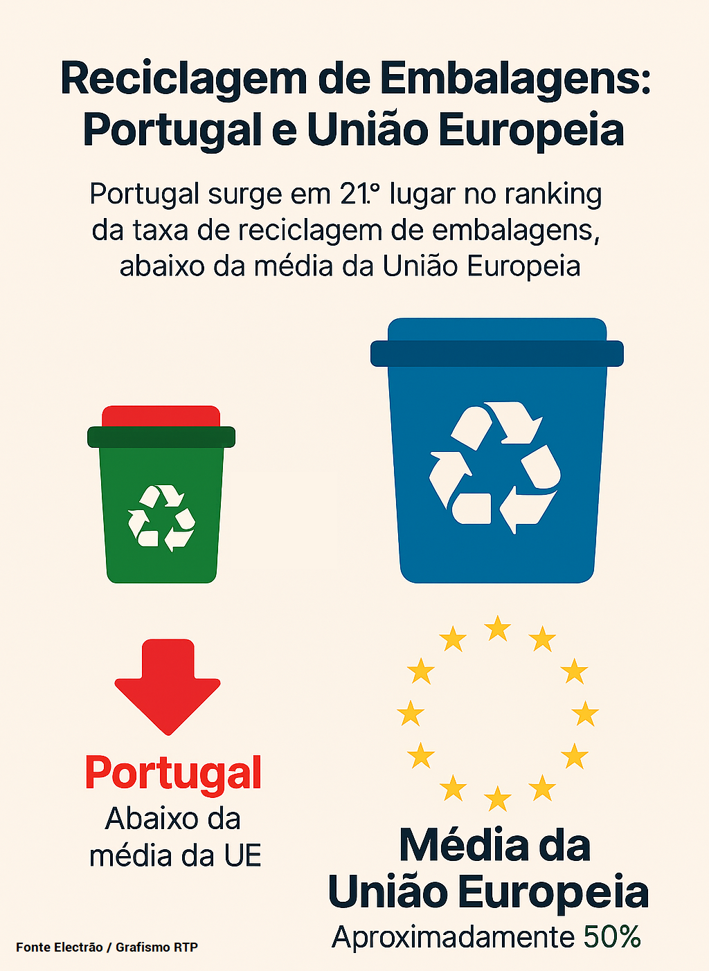 No contexto europeu, Portugal está atrasado a nível ambiental e surge na posição 21.º no ranking da taxa de reciclagem de embalagens, abaixo da média da União, segundo os dados mais recentes disponíveis do Eurostat (2023). O país gera níveis de resíduos de embalagens próximos da média europeia, mas continua sem transformar essa produção em reciclagem ao ritmo que as metas impõem.