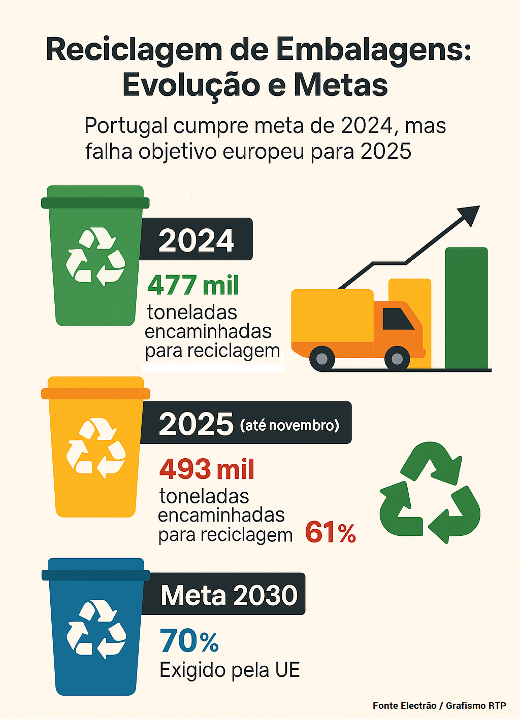 Em 2024, foram encaminhadas para reciclagem 477 mil toneladas de embalagens, o equivalente a 58,6 por cento de taxa de retoma (cumprindo a meta de 55 por cento desse ano, mas longe do novo patamar). Em 2025, até final de novembro, 493 mil toneladas já seguiram para reciclagem e, mantendo o ritmo, o ano deverá fechar cerca de 550 mil toneladas, o que aponta para 61 por cento — um valor aquém da meta europeia que estabelece 65 por cento.