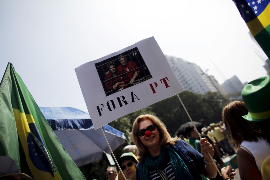 Cerca de meia centena de manifestantes gritaram palavras de ordem pedindo que a Presidente do Brasil se afaste da cena política e seja acusada pela justiça pelos escândalos de corrupção na petrolífera Petrobras e outros.