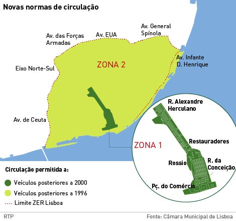 Já os carros com matrículas anteriores a 1996 ficarão também impedidos de circular na zona 2, que é definida pelos limites da Avenida de Ceuta, Eixo Norte-Sul, Avenidas das Forças Armadas, dos Estados Unidos da América, Marechal António Spínola, Santo Condestável e Infante D. Henrique.