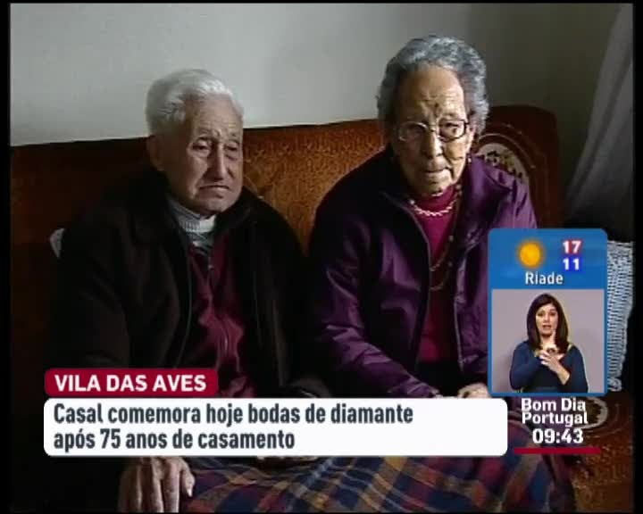 Hoje é dia de festa na Vila das Aves, em Santo Tirso, um casal comemora 75 anos de casamento. João Oliveira, de 96 anos, e Alzira Freitas, de 98, festejam as Bodas de Brilhante. Ainda não são conhecidos muitos pormenores da festa mas sabe-se que ao final da tarde haverá uma Missa.