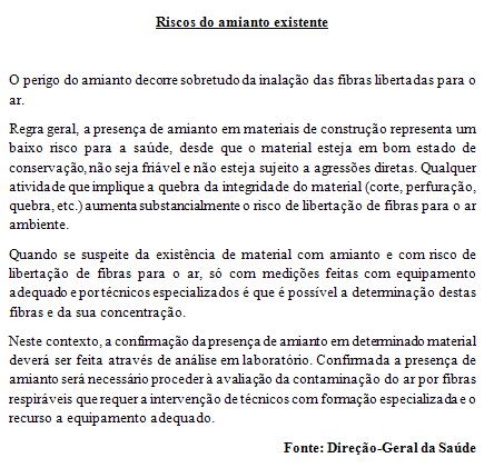 Entre as décadas de 50 a 80, do século passado, o amianto beneficiou de muita popularidade. Em 2003, a Assembleia da República recomendou ao Governo a criação de um inventário dos edifícios públicos com amianto, pediu um plano de substituição, quando o risco para a saúde o justificasse.