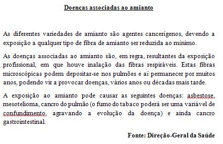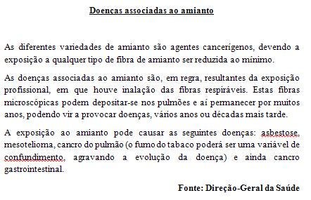 As doenças associadas ao amianto são, em regra, resultantes da exposição profissional, em que houve inalação das fibras respiráveis. Estas fibras microscópicas podem depositar-se nos pulmões e aí permanecer por muitos anos, podendo vir a provocar doenças, vários anos ou décadas mais tarde”, pode ler-se no sítio da internet da DGS.