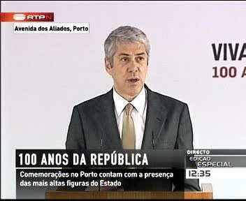 A segunda intervenção das comemorações oficiais pertenceu ao primeiro-ministro, José Sócrates, que, em vez da nostalgia optou pela celebração. Comemorar o centenário da República é "um momento não de nostalgia, mas de celebração", afirmou no Porto, Sócrates.