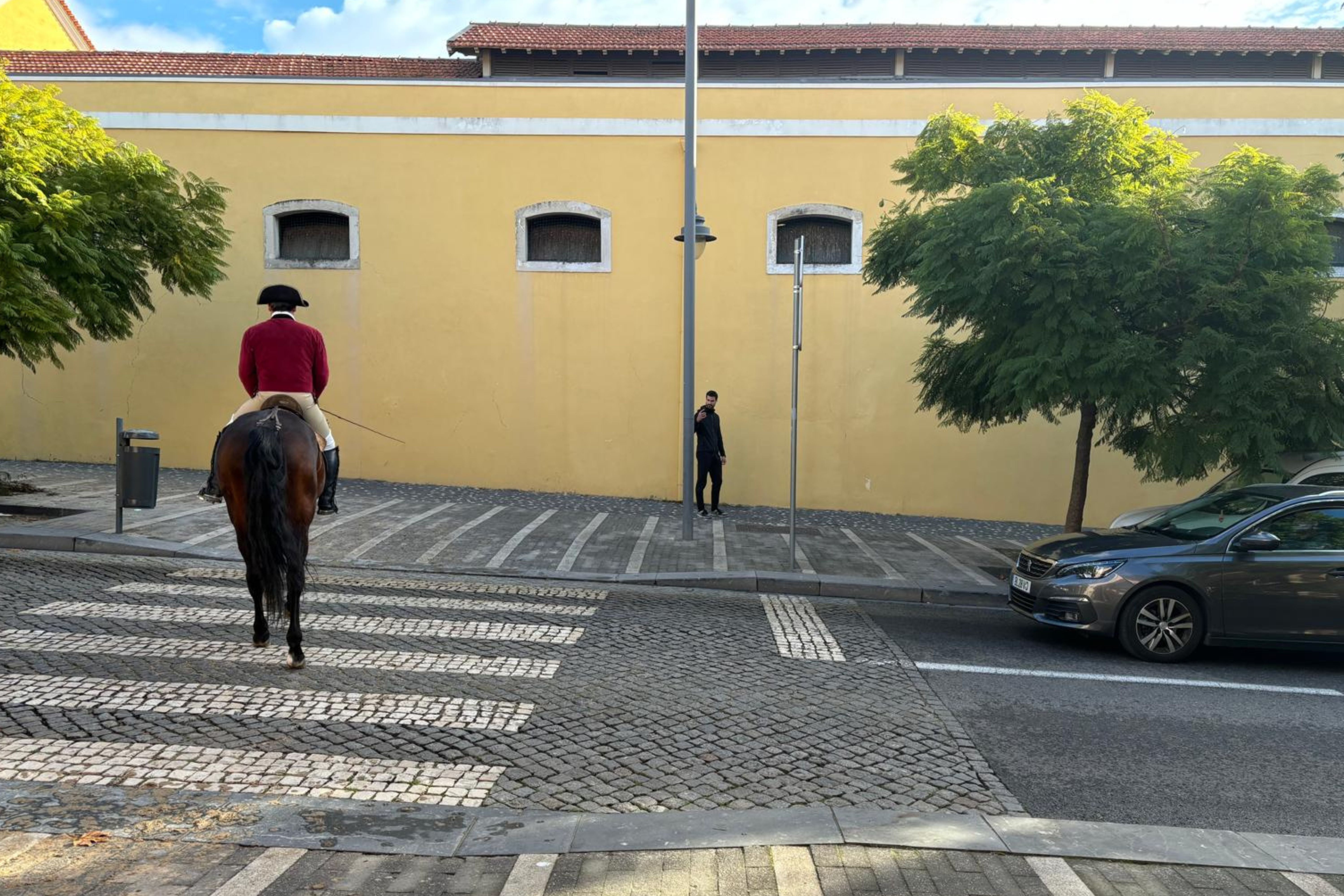 O cavalo lusitano Jiripiti e o seu cavaleiro saem, vão pelo passeio e atravessam a passadeira até chegar ao espaço com o piso coberto de areia.