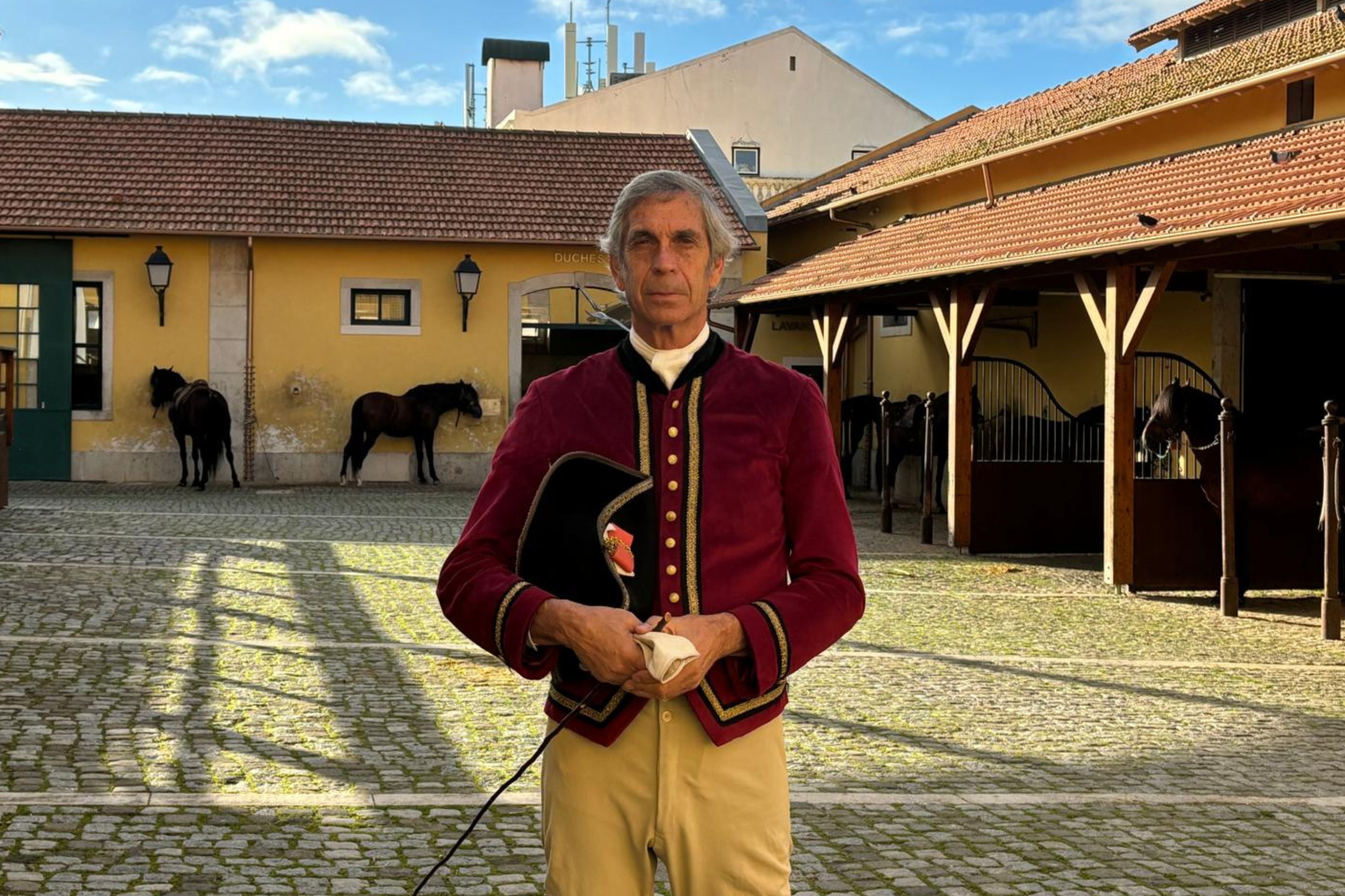 Cavalos param trânsito para chegar ao picadeiro. Uma manhã na escola que enaltece a arte equestre