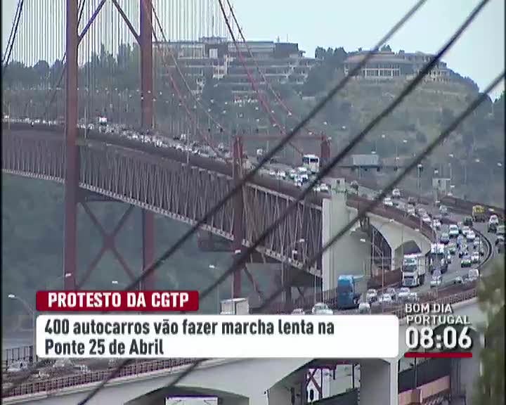 A CGTP marcou para hoje uma jornada nacional de luta contra a exploração e o empobrecimento. No Porto e em Lisboa vão fazer-se manifestações. O protesto no Porto integra a travessia a pé da ponte do Infante e em Lisboa a manifestação vai ser feita de autocarro. O Governo não autorizou a travessia a pé da ponte 25 de Abril, alegando questões de segurança, por isso a central sindical optou por uma concentração em Alcântara, que deverá contar com a participação de "milhares de pessoas". O secretário geral da CGTP estima que vão ser mais de 400 autocarros com manifestantes do sul e centro do país, a atravessar a ponte.