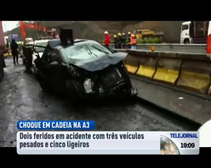 Um choque em cadeia com nove viaturas provocou dois feridos na A3. A colisão ocorreu no sentido Porto-Braga numa altura em que a chuva era intensa. De acordo com a Brigada de Trânsito da GNR da Maia, o acidente envolveu três veículos pesados e cinco ligeiros e obrigou ao corte da autoestrada, que entretanto já foi reaberta ao trânsito.