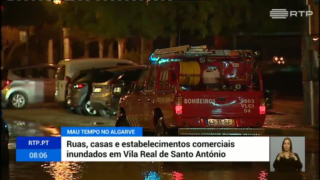 Várias ruas ficaram inundadas em Monte Gordo e Vila Real de Santo António, no Algarve, por causa da chuva intensa.