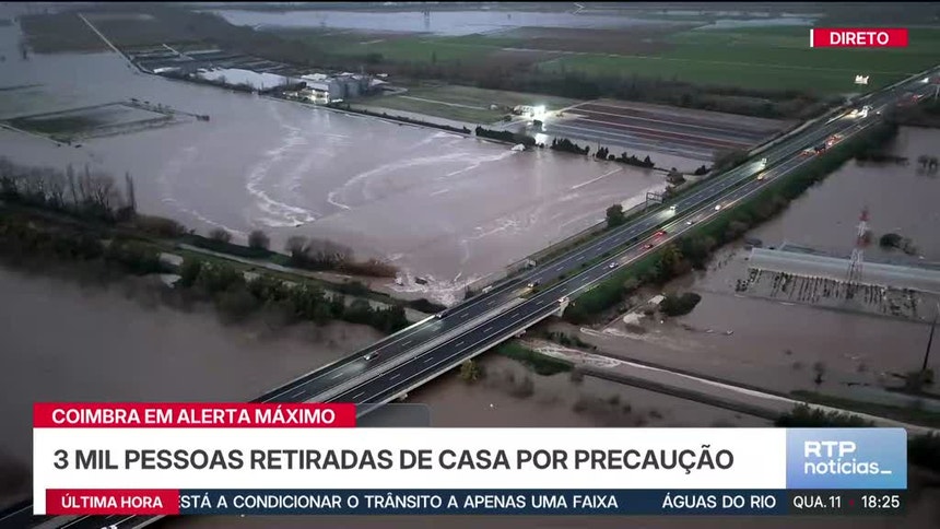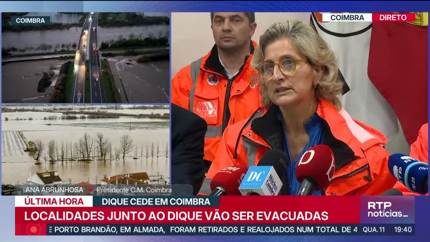 - Há risco iminente de derrocada dos diques em Coimbra e três mil pessoas estão a ser retiradas de casa. O possível colapso poderá provocar inundações, razão pela qual a Câmara Municipal decidiu ainda evacuar três lares em São Martinho do Bispo. A decisão foi tomada depois de uma reunião entre a autarquia, a Proteção Civil e a Agência Portuguesa do Ambiente;