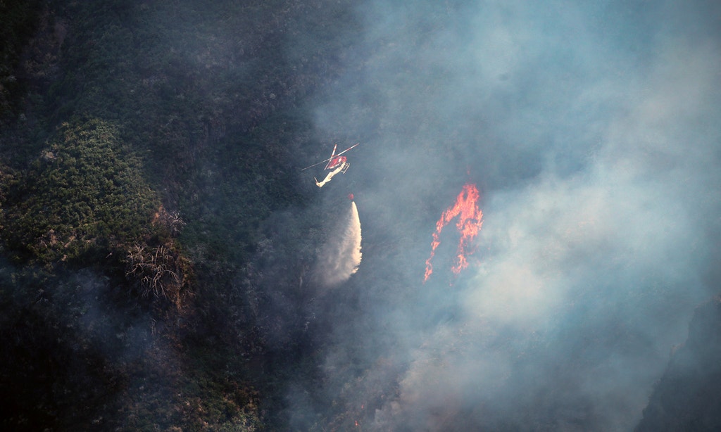 Um helicóptero lança água sobre as chamas no Pico Ruivo, o ponto mais alto da Madeira, no concelho de Santana</br></br>O incêndio na ilha deflagrou a 14 de agosto, nas montanhas da Ribeira Brava, espalhando-se gradualmente pelos concelhos de Câmara de Lobos, Ponta do Sol e, através do Pico Ruivo, Santana.