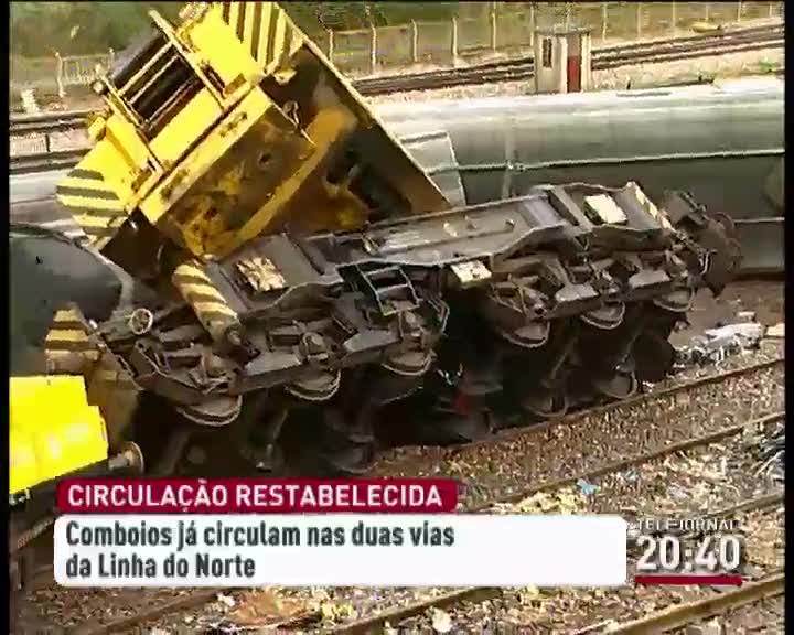 Está reestabelecida a circulação ferroviária na linha do Norte em Alfarelos em ambas as vias. O choque entre duas composições não fez vítimas mortais, mas obrigou ao corte imediato das duas vias. O acidente envolveu um comboio intercidades e um regional e deverá ser explicado nas próximas horas, uma vez que o ministro da Economia deu 72 horas à CP e à Refer para explicarem o sucedido.