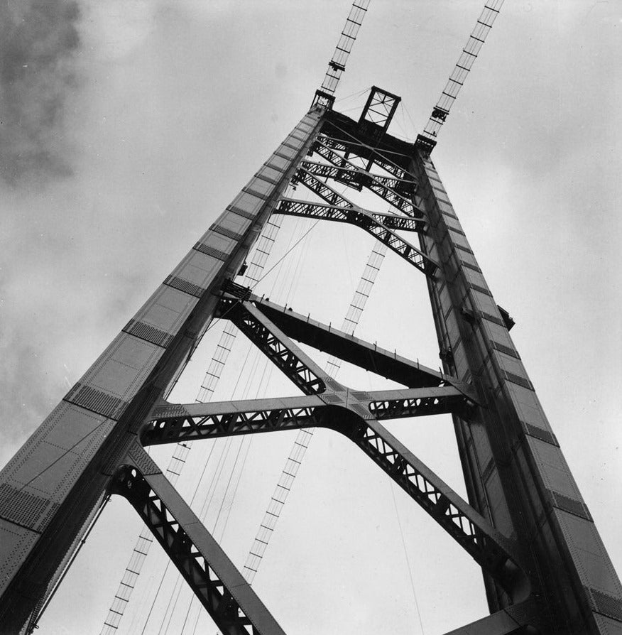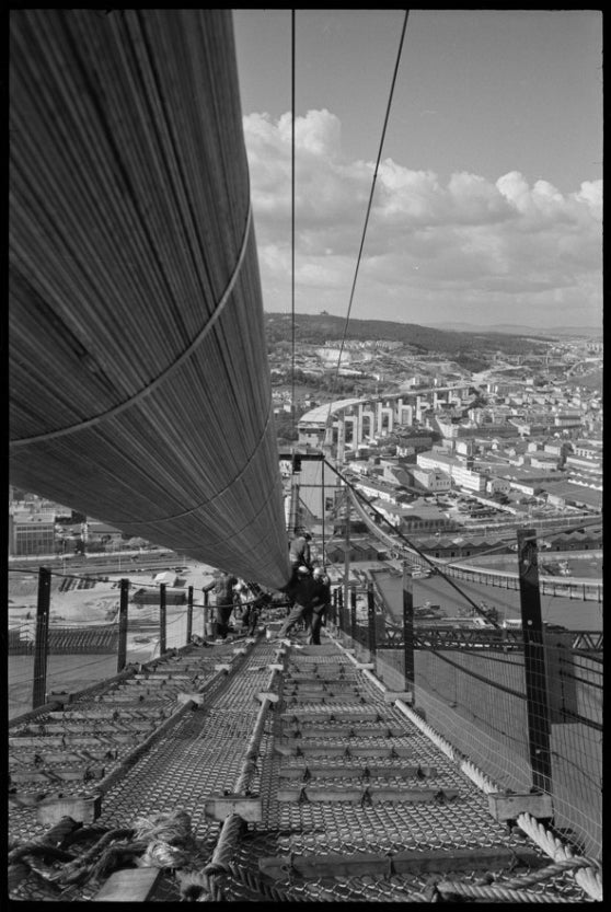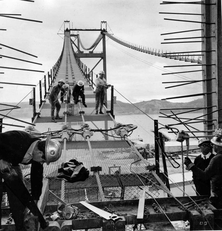 Com as fundações criadas e as duas torres principais construídas, foi necessário estender dois passadiços (passeio do gato, ou catwalk, em inglês), um de cada lado das torres, para facilitar a deslocação dos trabalhadores da obra e para que fosse possível começar a fiação dos cabos principais.
