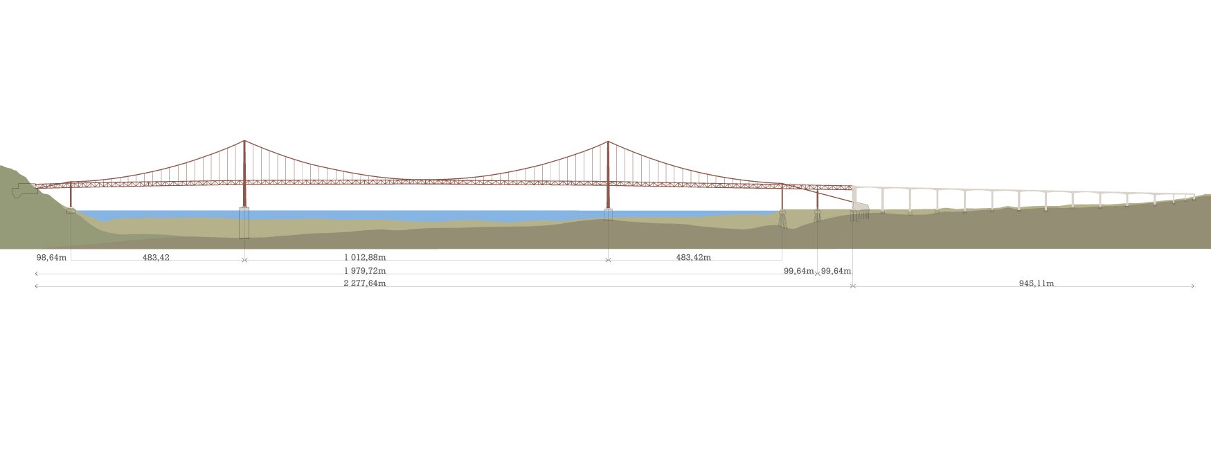 Estas foram as principais estruturas as serem construídas suportando todo um vasto tabuleiro com 1.979 metros de comprimento, sendo o restante tabuleiro suportado por pequenas torres de suporte e sustentação.