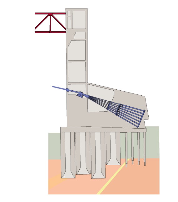 A viga de rigidez e o tabuleiro são suspensos desses grandes cabos que amarram a dois maciços de betão, localizados nas margens.
