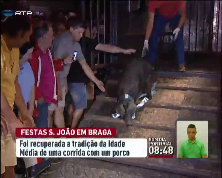 As festas do S. João de Braga tiveram, este ano, um novo protagonista. A organização resolveu recuperar tradições do tempo da idade média e promoveu, ontem à noite, uma corrida com um porco preto. As associações de defesa dos animais ainda tentaram travar a iniciativa e chegaram a prometer novos protestos, que acabaram por não acontecer.
