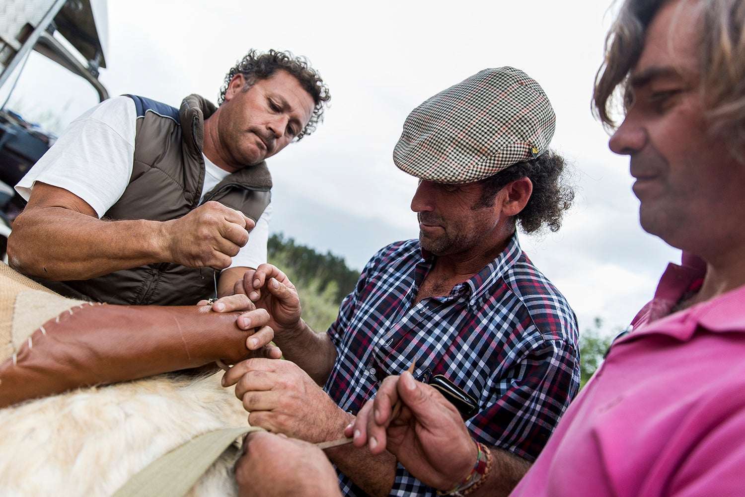 “Olhe que não é assim que uma senhora monta”, alerta um dos senhores, “é de lado”.